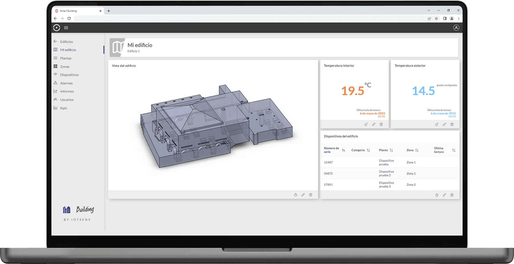 Representación gráfica de la posición y últimos valores medidos por los dispositivos desplegados por la solución de edificios inteligentes.