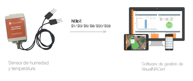 IoTsens ha desarrollado un dispositivo hardware para VisualNACert que monitoriza la temperatura y humedad en el ámbito de la agricultura y se integra con el software agrícola del cliente. Este dispositivo permite medir tanto la humedad y temperatura del ambiente como la del suelo.
