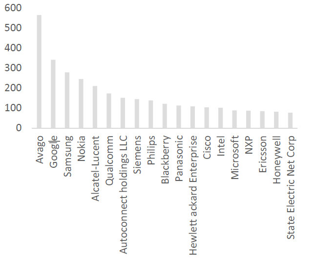 Los principales poseedores de patentes vienen de diferentes sectores como la electrónica de consumo, las telecomunicaciones o el software. Qualcomm es la compañía líder en múltiples jurisdicciones así como en solicitudes del Tratado de Cooperación en materia de Patentes, lo que sugiere intenciones de licenciar sus tecnologías de forma mundial.